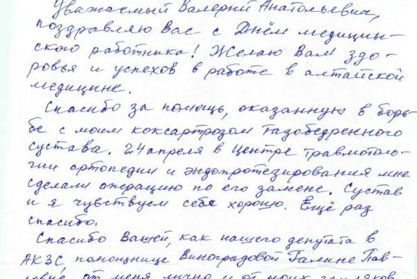 Также благодарим помощника депутата Виноградову Галину Павловну за внимание и ответственное отношение к своим профессиональным и общественным обязанностям», - пишут жители Тюменцевского района в одном из обращений.