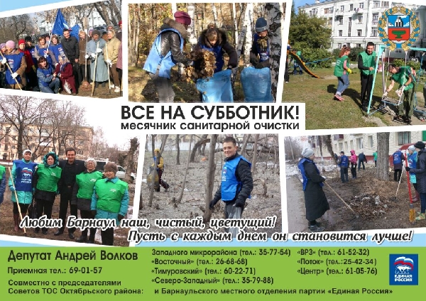 В рамках проекта «Экология России» и месячника санитарной очистки во всех микрорайонах Октябрьского района Барнаула 16 октября прошел День единого субботника, организованный при поддержке депутата фракции «Единая Россия» в Алтайском краевом Законодательном Собрании Андрея Волкова и администрации Октябрьского района.