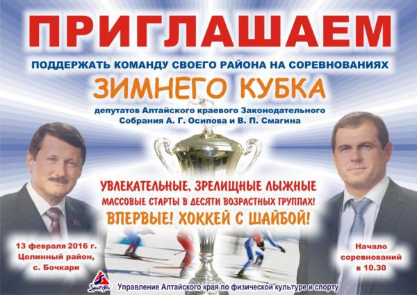 13 февраля в селе Бочкари Целинного района состоятся межрайонные соревнования по лыжным гонкам и хоккею с шайбой на призы депутатов Алтайского краевого Законодательного Собрания Андрея Осипова и Вадима Смагина.