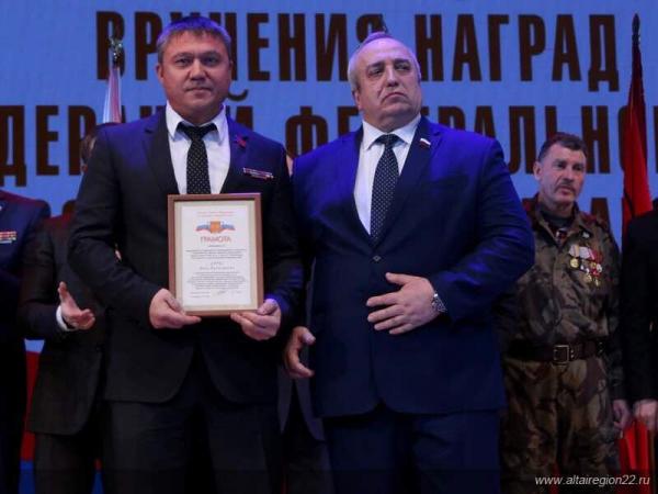 После окончания торжественной части началась церемония награждения. В число награжденных попал и депутат АКЗС, председатель Славгородского отделения РСВА Иван Диркс. Он был награжден почетной грамотой комитета Совета Федерации по обороне и безопасности РФ. Награда вручена за многолетнюю плодотворную деятельность по обеспечению военной безопасности РФ, высокий профессионализм в руководстве ветеранским движением в Алтайском крае, активное участие в патриотическом, духовно- нравственном воспитании молодежи, укреплении патриотических традиций среди подрастающего поколения, верность боевым и войсковым традициям.