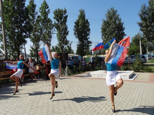 Звучали патриотические песни в исполнении солиста РДК Тохтара Бурамбаева.