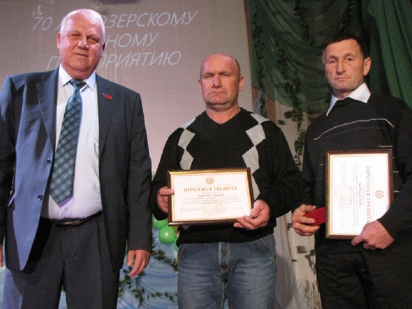 На торжественном мероприятии по случаю празднования юбилея присутствовал депутат фракции «Единая Россия» в АКЗС Виталий Щербаков. В своем выступлении он отметил, что предприятие движется по пути развития переработки леса, внедрения новых технологий. «К работникам леса относят и тех, чья работа связана с лесоразведением, уходом за лесными культурами. Благородный труд лесоводов издавна находится в ряду наиболее уважаемых профессий. Бережное отношение к лесу - долг не только профессионалов, ну и всего общества», - отметил Виталий Щербаков. Он пожелал всем сотрудникам предприятия в их юбилейный праздник удачи, счастья и вручил Почетные грамоты АКЗС работникам Озерского лесного предприятия.