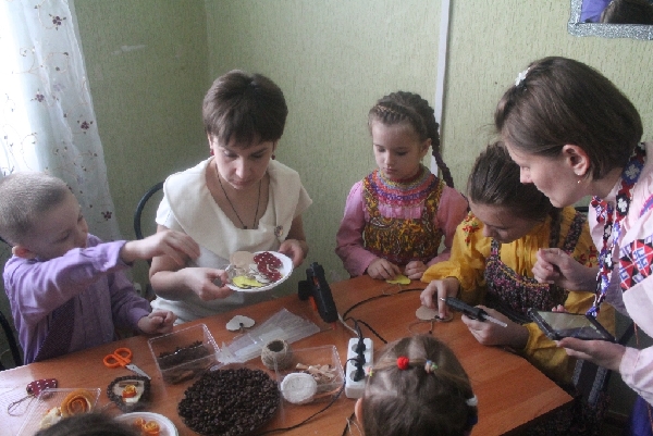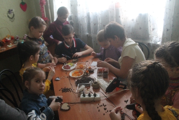 Для детей было организовано путешествие в мастерскую «Кофейный аромат». Для них прошел мастер-класс по изготовлению сувениров из зерен кофе с добавлением украшений из природных материалов. Приготовленный своими руками подарок ребята смогли вручить своим мамам и бабушкам.