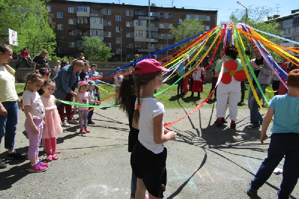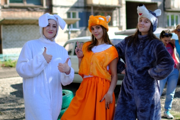 Впервые во дворе дома по улице Красноармейской,174 в День защиты детей было так многолюдно. Поучаствовать в игровой программе пришли целыми семьями. Взрослых и детей встречали мультипликационные герои- это студенты Бийского педагогического колледжа подготовили целое костюмированное шоу. Ребята вместе с педагогами специально написали сценарий, продумали игры, и номера. Так в развлекательной программе участвовал театр пластического танца «Территория».