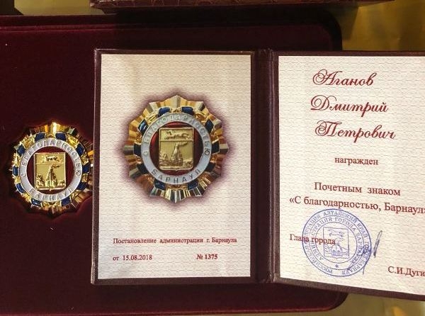 Почетными наградами в этом году было отмечено более 70 человек, среди них - депутат Алтайского краевого Законодательного Собрания Дмитрий Аганов. Он был награжден почетным знаком «С благодарностью, Барнаул».