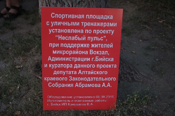 В итоге образовалась инициативная группа местных жителей, а проект получил название - «Неслабый пульс». Проект выиграл муниципальный грант. Часть средств на строительство площадки собрали жители микрорайона, остальное добавил депутат. В течение лета площадку разровняли, закупили уличные тренажеры, выбрали места для их установки, залили основание. В день открытия тренажеры - прошли «испытание на прочность»: дети и родители опробовали их в действии. Для ребят была организована конкурсно-развлекательная программа.