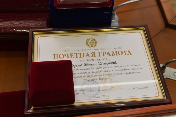 Председатель комитета АКЗС по бюджету и налогам Владимир Устинов 10 сентября принял участие во вручении наград в центре развития творчества детей и молодежи Железнодорожного района. Награды краевого, городского и районного уровня получили 88 человек. Трое из них получили Благодарственные письма Алтайского краевого Законодательного Собрания.
