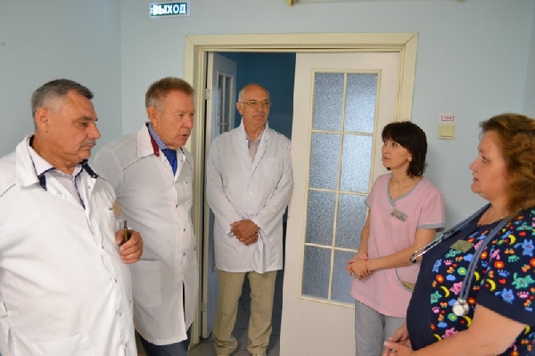 Главный врач больницы Владимир Токарев познакомил Николая Федоровича Герасименко с материально-технической базой, основными направлениями и результатами деятельности клинической больницы.