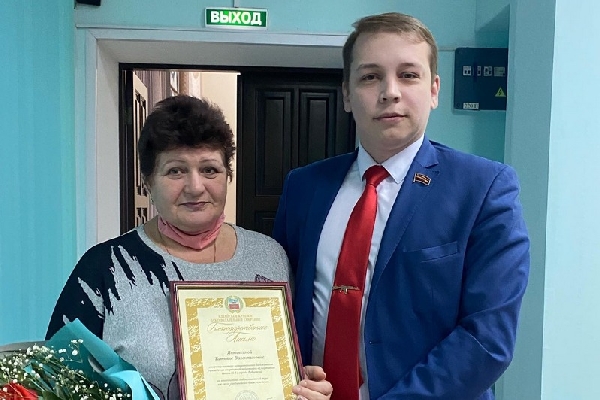 Заместитель председателя комитета АКЗС по правовой политике и местному самоуправлению Сергей Матасов вручил благодарственное письмо краевого парламента сторожу-вахтеру спортивной школы № 1 города Рубцовска Татьяне Янюшкиной.