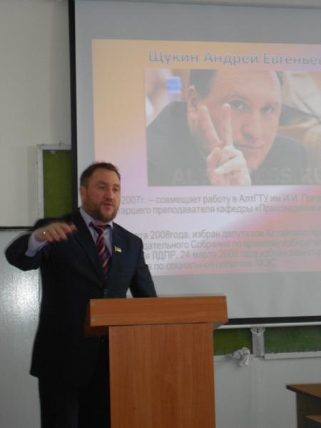 Депутат фракции ЛДПР в АКЗС и руководитель алтайских либерал-демократов Андрей Щукин 6 февраля провел своеобразный «урок успеха» у студентов Барнаульского кооперативного колледжа. Подобные лекции Андрей Щукин проводит каждый год в рамках месячника молодого избирателя.