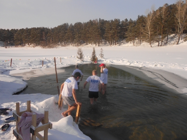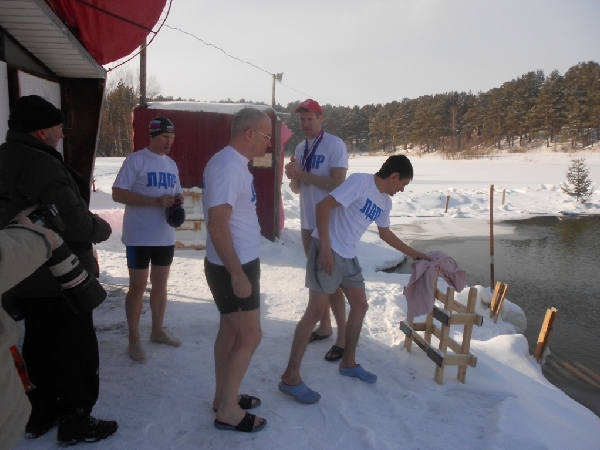 Депутат фракции ЛДПР в краевом парламенте Юрий Гальченко и руководитель барнаульских либерал-демократов Андрей Саркисян в компании «моржей» из Алтайской Федерации «Белые медведи» сделали заплыв в ледяной полынье.