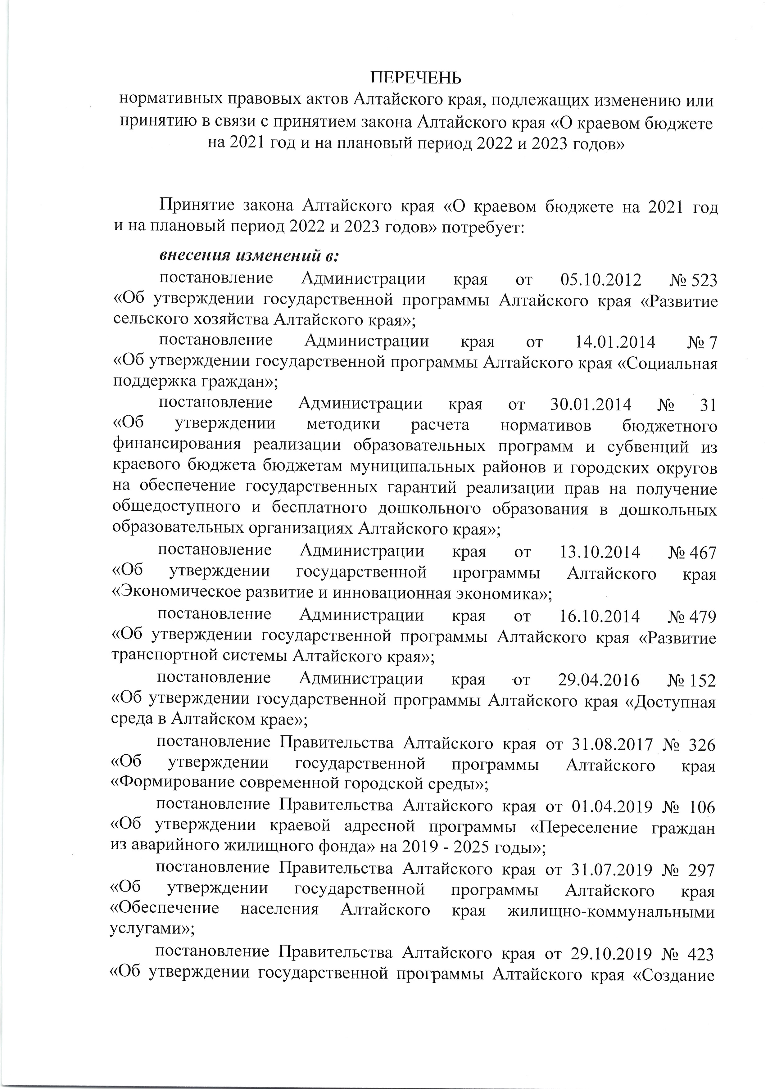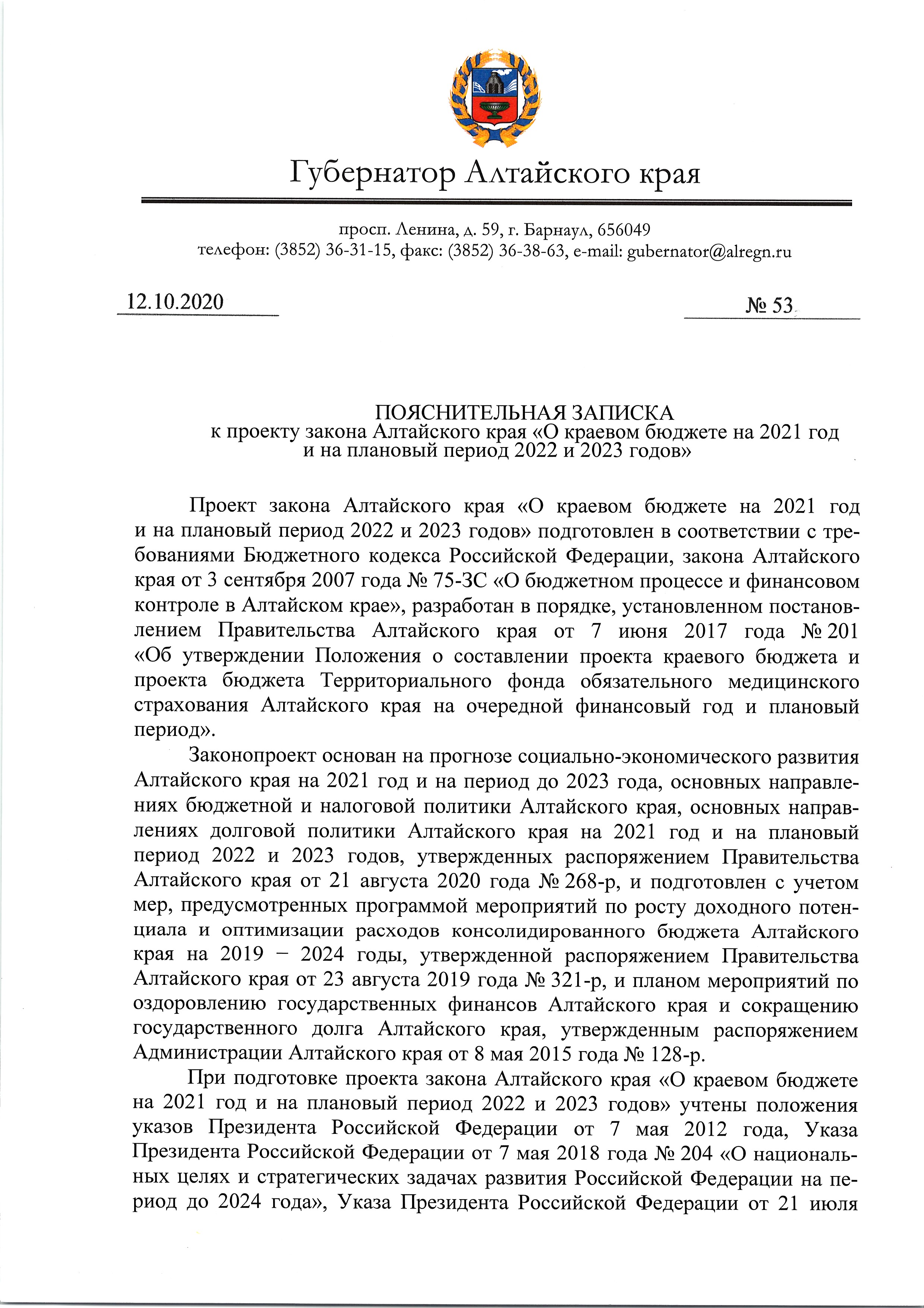 О проекте закона Алтайского края «О краевом бюджете на 2021 год и на плановый период 2022 и 2023 годов»